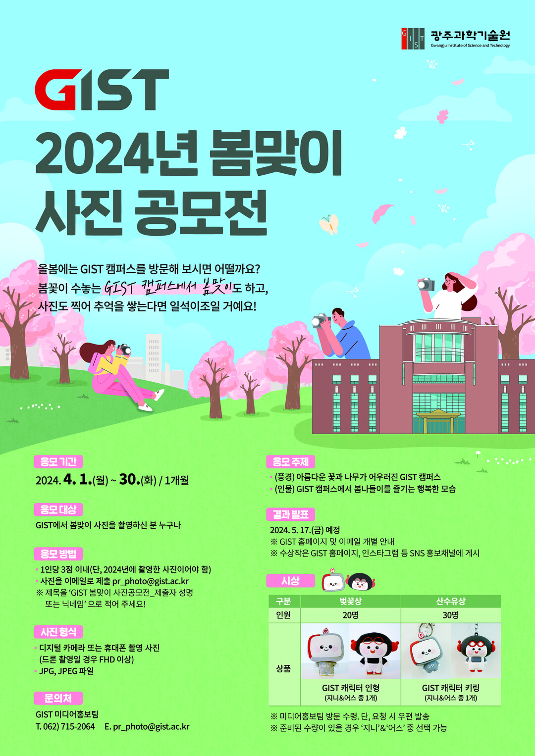 한편, 이번 사진 공모전의 결과는 5월 17일 이메일을 통해 개별 안내되며, 수상작은 홈페이지와 인스타그램 등 GIST의 온라인 홍보 채널에 게시될 예정이다.