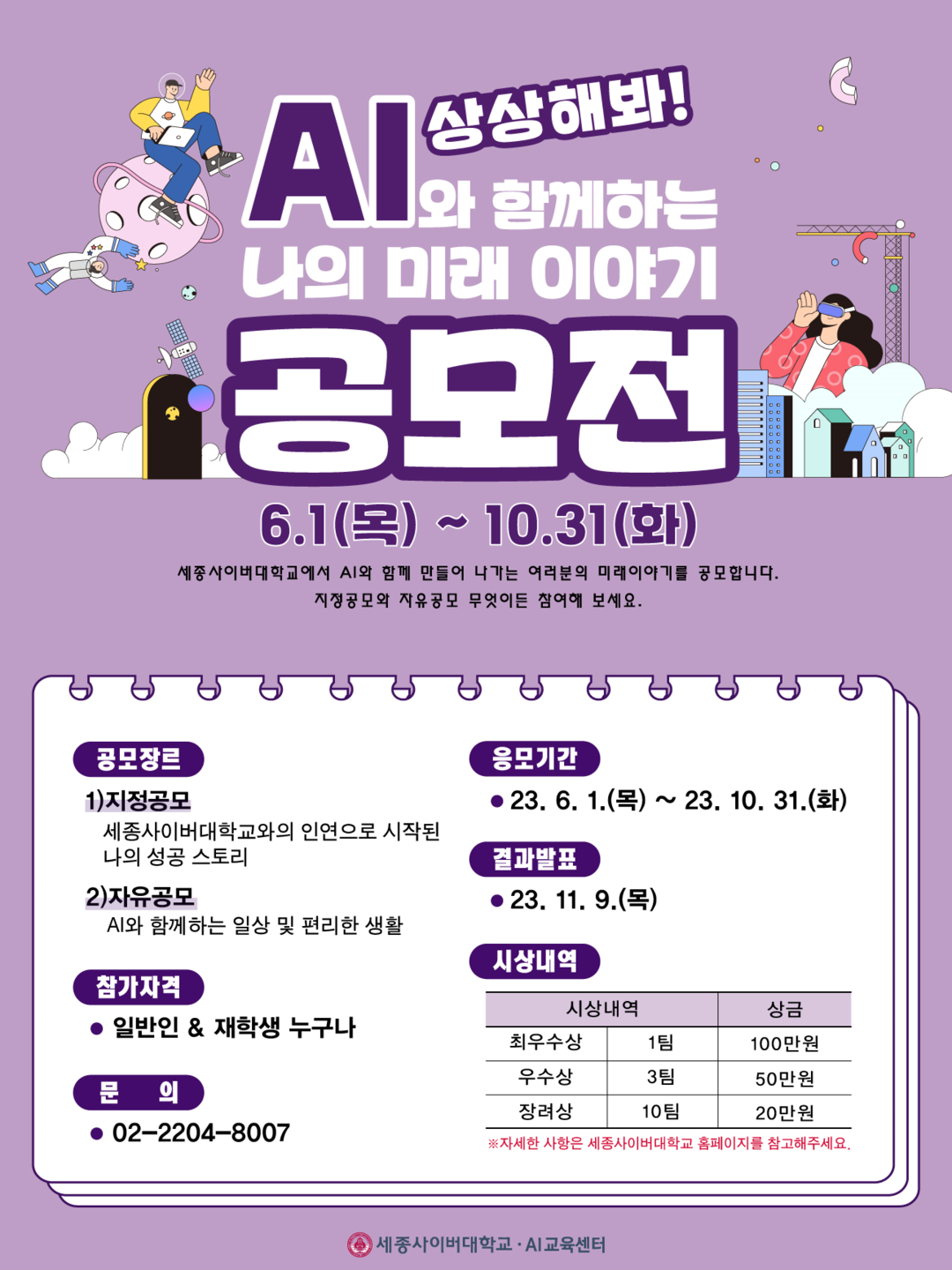 공모전에는 세종사이버대 학생을 포함해 일반인 누구나 참여할 수 있으며, AI 활용을 통한 상상 속의 미래 모습과 아이디어를 구체화하는 경험과 함께 공모전 수상의 기회를 얻을 수 있다.