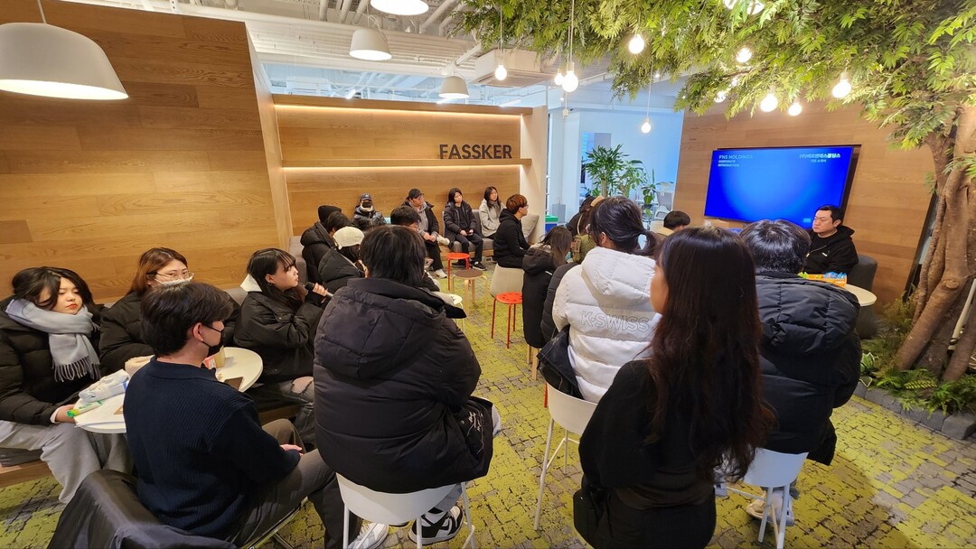 에프앤에스홀딩스 산업체 특강 및 견학을 하고 있는 게임애니메이션과 학생들. 사진=영남이공대 제공 |