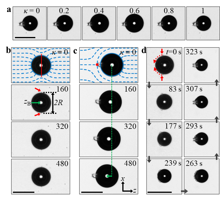 연구팀은 이런 현상을 물리학적으로 설명했다. 액정은 공기 방울 옆에서 구조가 흐트러지며 위상 결점이라는 특별한 구조를 만든다. 결점이 공기 방울의 어느한쪽 부분에서만 만들어지기 때문에, 방울의 대칭적인 모양에도 불구하고 한 방향으로 더 큰 힘을 받을 수 있다.