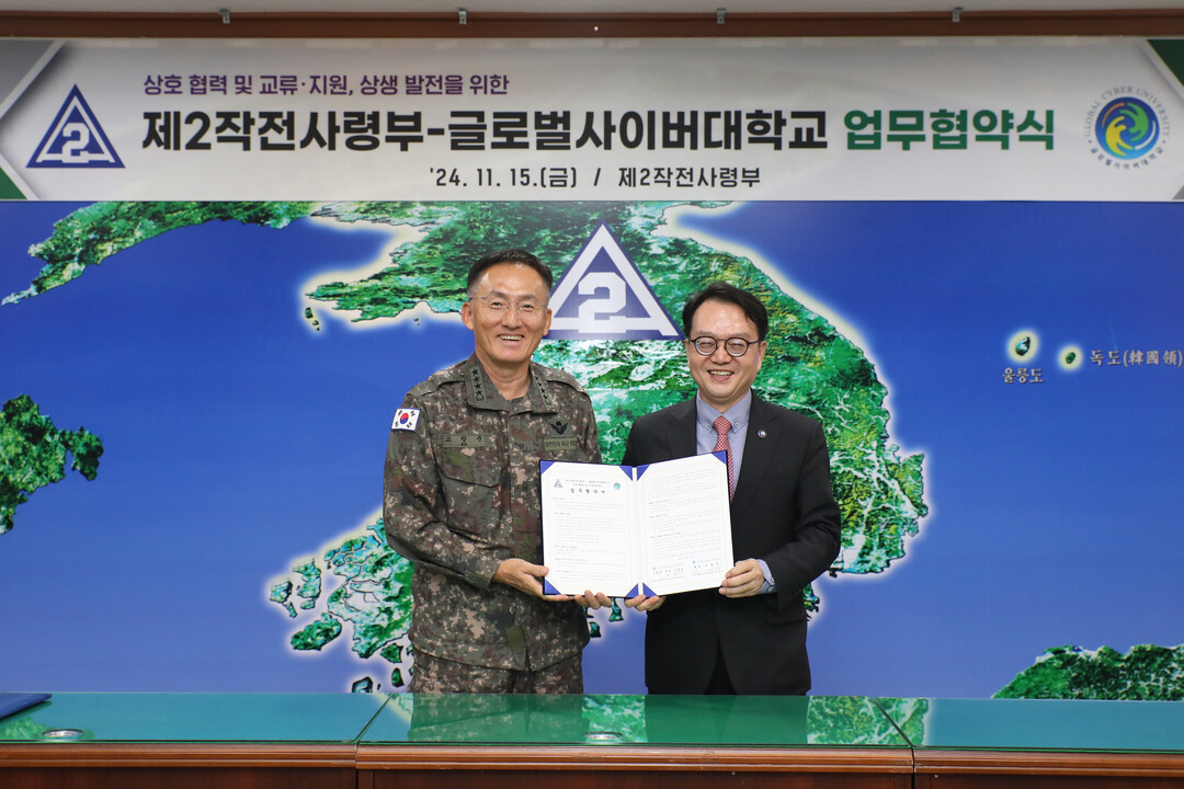 [대학저널 이선용 기자] 글로벌사이버대학교는 육군본부 제2작전사령부(사령관 대장 고창준)와 군 장병들의 역량 향상에 상호 협조하기 위해 지난 15일 업무협약을 체결했다고 19일 밝혔다.