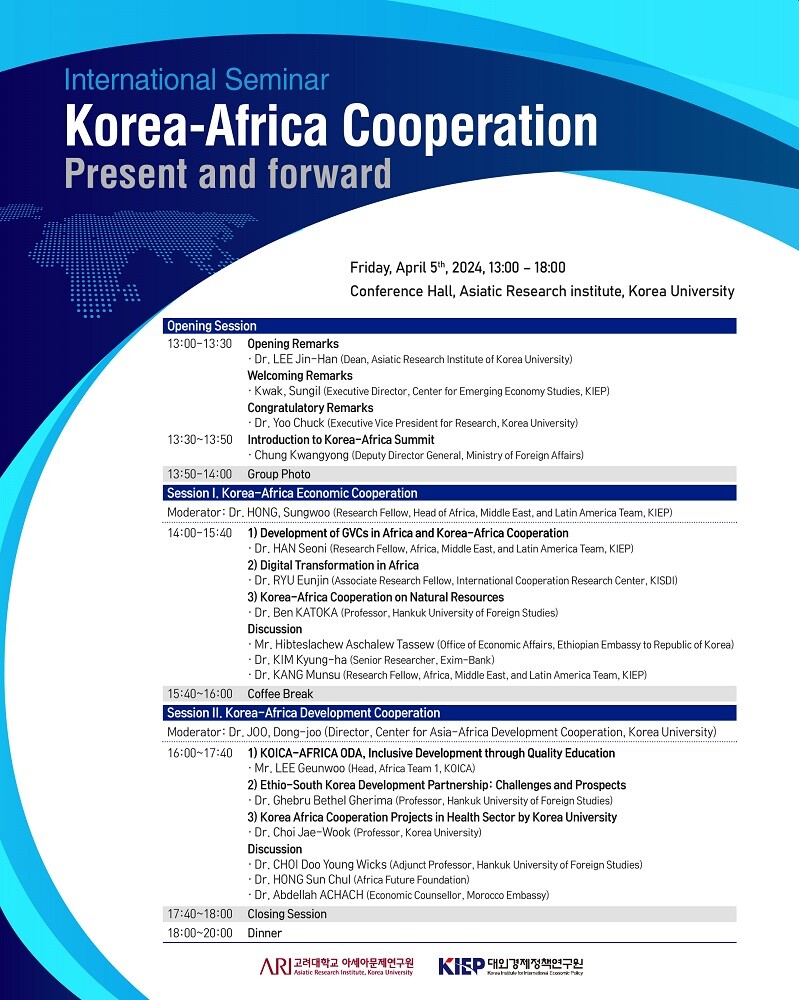[대학저널 이선용 기자] 고려대학교 아세아문제연구원이 4월 5일 오후 1시부터 고려대 아세아문제연구원에서 ‘한국과 아프리카 협력의 현재와 미래’라는 주제로 국제세미나를 개최한다.