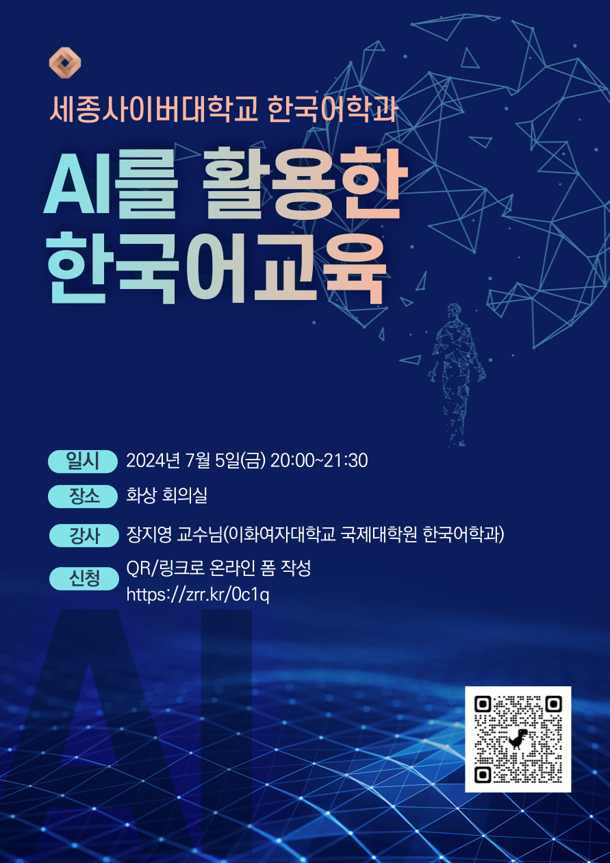 박수연 세종사이버대 한국어학과장은 “이러한 시기에 한국어 교사들에게 인공지능을 중심으로 높은 수준의 디지털 문식력이 요구되는바 이번 특강은 예비, 현직 한국어교원 등의 한국어교육 관련 종사자는 물론 한국 언어·문화 교육 관심자들에게도 큰 도움이 될 것”이라고 전했다.
