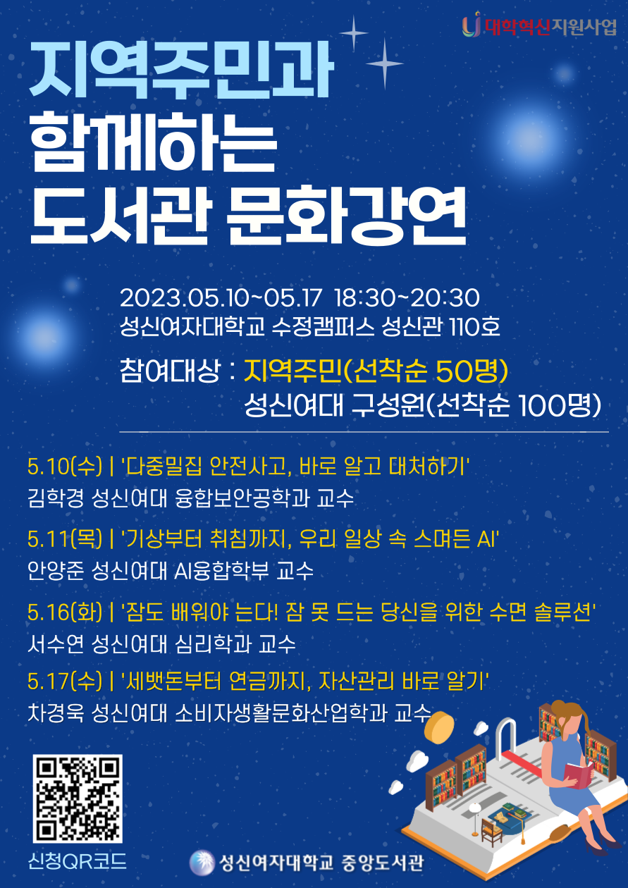 참가신청은 5월 16일까지 성신여대 중앙도서관 홈페이지를 통해 접수할 수 있으며, 회차별로 선착순 150명(지역주민 50명, 교내 구성원 100명)까지 참여할 수 있다.
