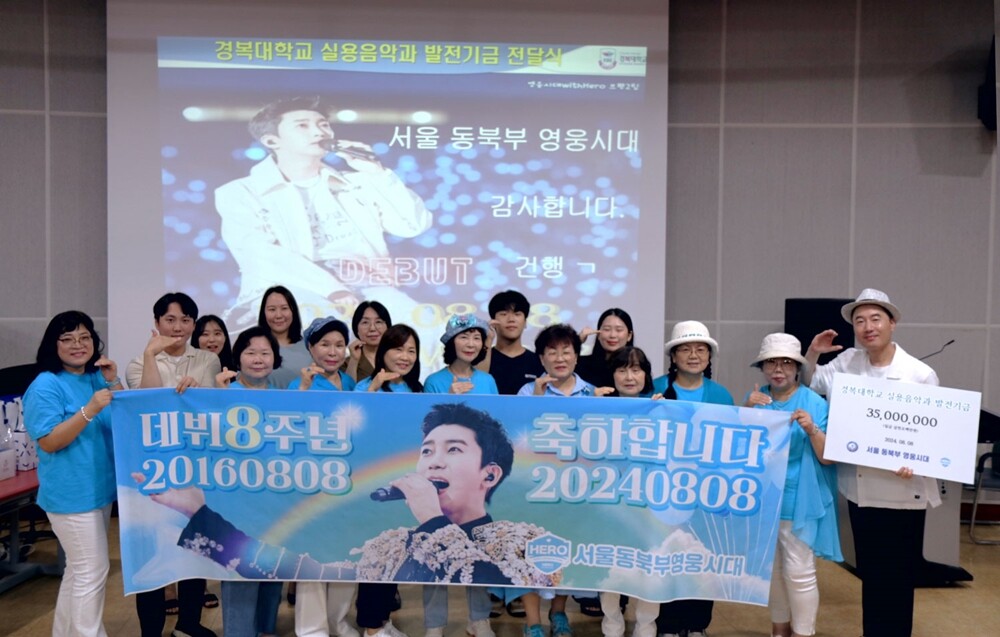 [대학저널 온종림 기자] 가수 임영웅의 팬클럽 ‘서울 동북부 영웅시대’가 지난 8일 임영웅의 데뷔 8주년을 기념하여 경복대학교 실용음악학과에 3,500만원의 발전기금을 전달했다.