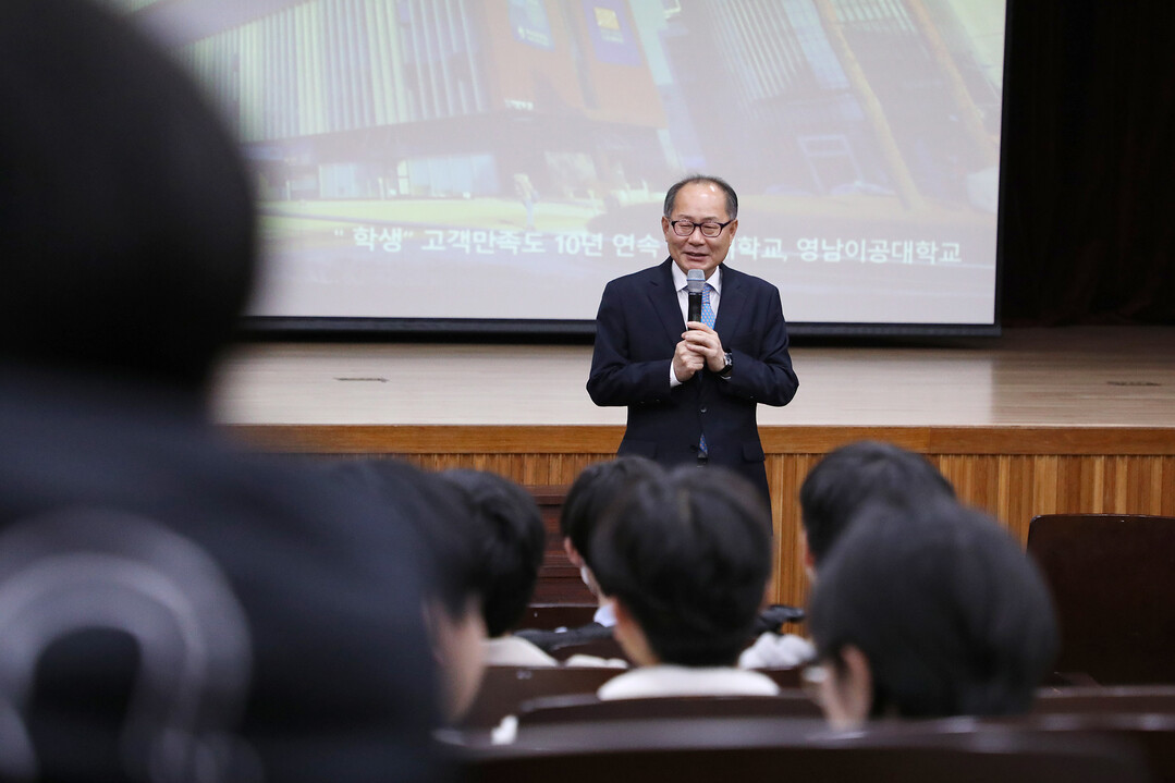 이재용 영남이공대 총장이 대진고 학생들에게 환영의 인사를 하고 있다. 사진=영남이공대 제공 |