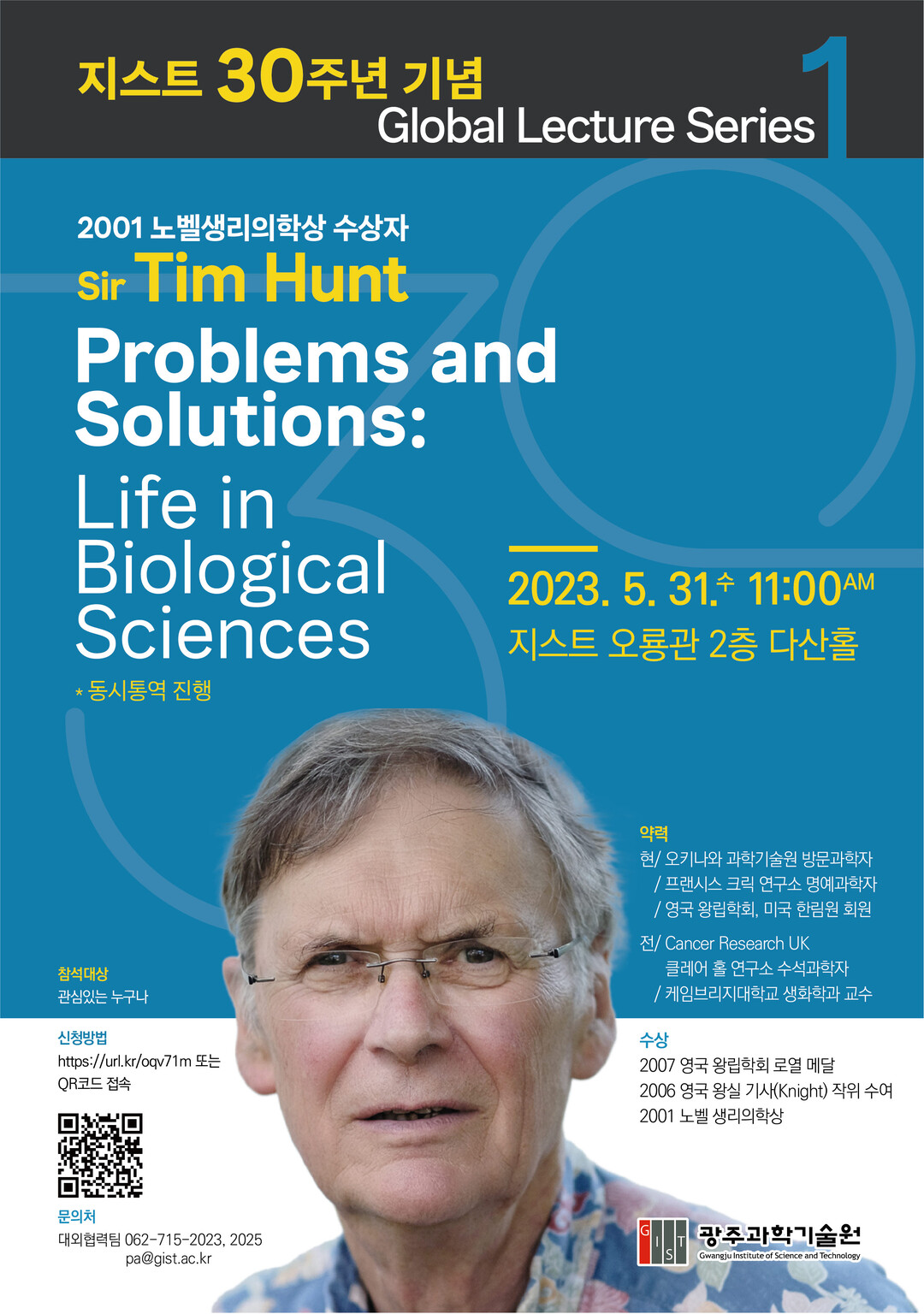 특강에는 GIST 구성원뿐 아니라 과학에 관심 있는 초·중·고 학생과 시민 모두가 참여할 수 있다. 특강은 동시통역으로 진행되며, 참가신청은 행사 포스터의 QR코드를 이용하면 된다.