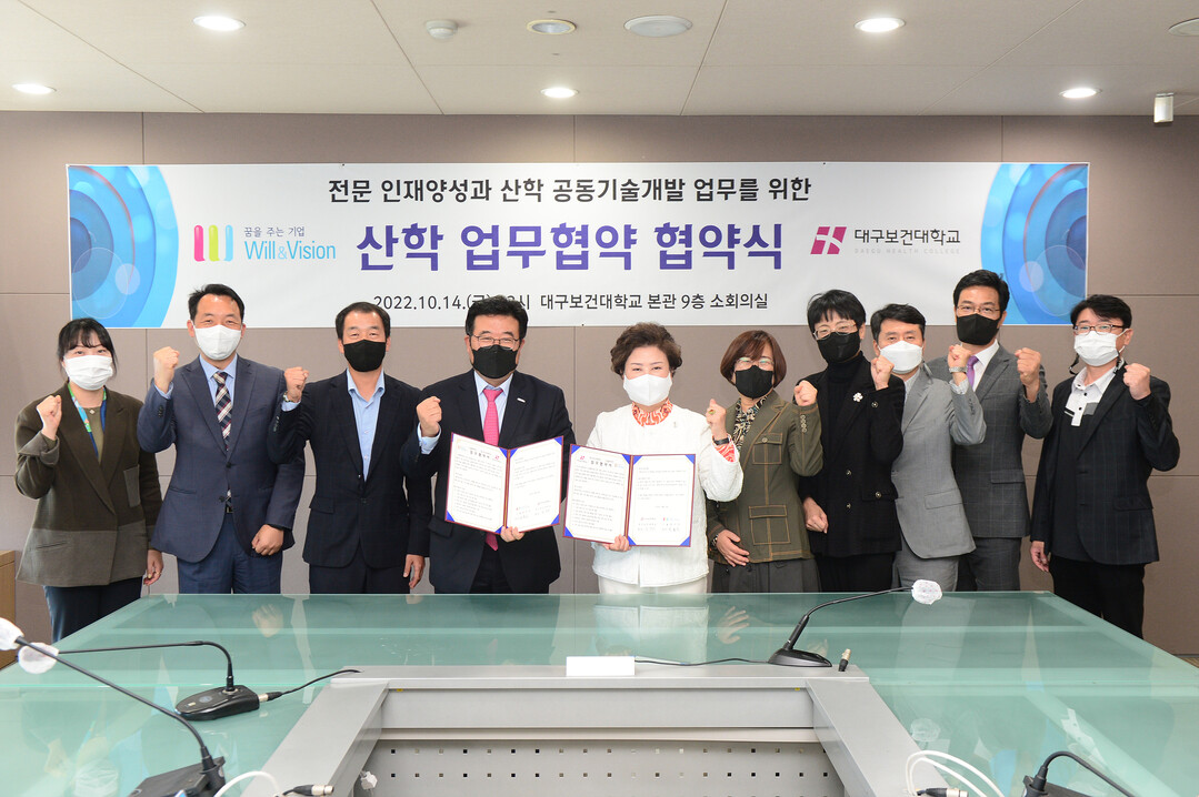 대구보건대와 (주)윌앤비전은 지난 14일 대학 본관 9층 소회의실에서 인재양성과 산학협력을 위한 업무협약을 체결했다.