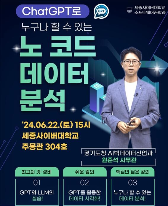 [대학저널 이선용 기자] 세종사이버대학교 소프트웨어공학과는 오는 6월 22일 오후 3시 주몽관 304호에서 ‘ChatGPT로 누구나 분석할 수 있는 노 코드 데이터 분석’ 특강을 개최한다고 18일 밝혔다.