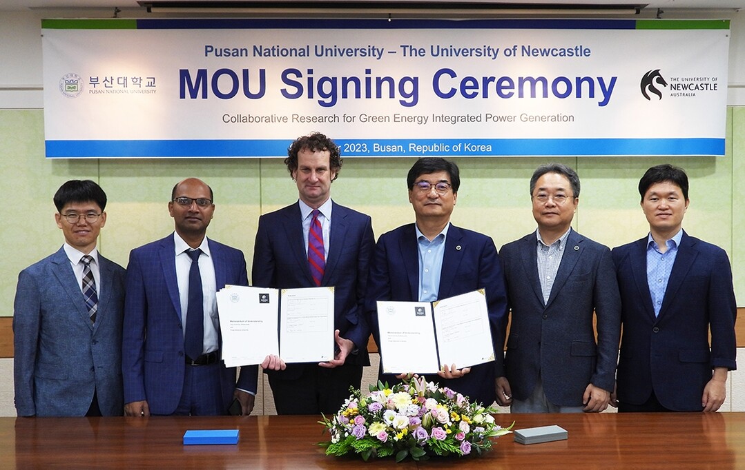부산대가 1일 호주 산학협력 분야 1위 대학인 뉴캐슬대와 에너지 분야 ‘글로벌연구허브(GHUB)센터 협력 MOU’를 체결했다. 사진=부산대 제공 |