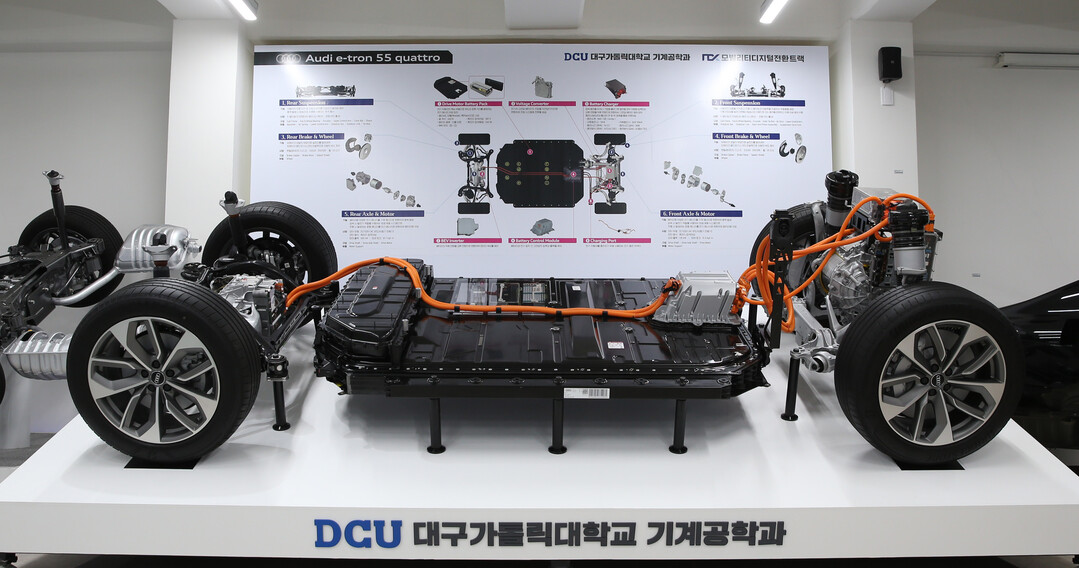 대구가톨릭대 RIS모빌리티디지털전환사업단은 15일 아우디 이트론 55 콰트로의 교육용 EV 플랫폼을 본교 기계공학과 모빌리티체험관에 구축했다. 교육용 EV 플랫폼과 3D 모델은 전기차 구조 교육에 활용되며 지역 미래차전환 기업 및 연구소에도 개방되어 운용될 예정이다. 이에 따라 지역 산업의 미래 자동차 기술 전환을 가속화하는데 크게 기여할 것으로 기대된다.
