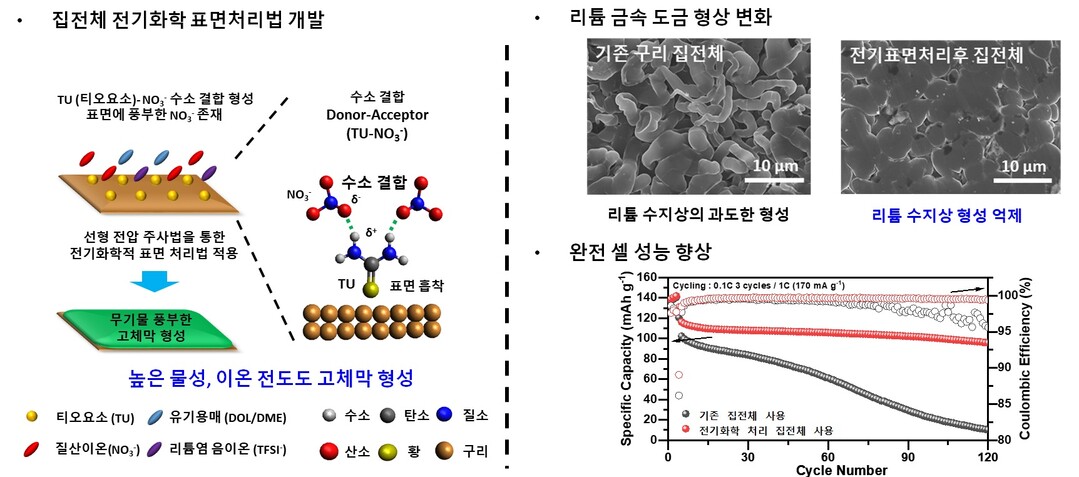 연구진은 유기 전해질 내에서 티오요산(Thiourea)의 리튬 질산염(LiNO3) 분해 촉매 효과를 최초로 규명하고, 이를 이용한 간단한 전기화학적 공정을 통해 리튬금속 전지 음극에 사용되는 구리 집전체 표면에 무기물이 풍부한 인공 고체막을 형성했다.