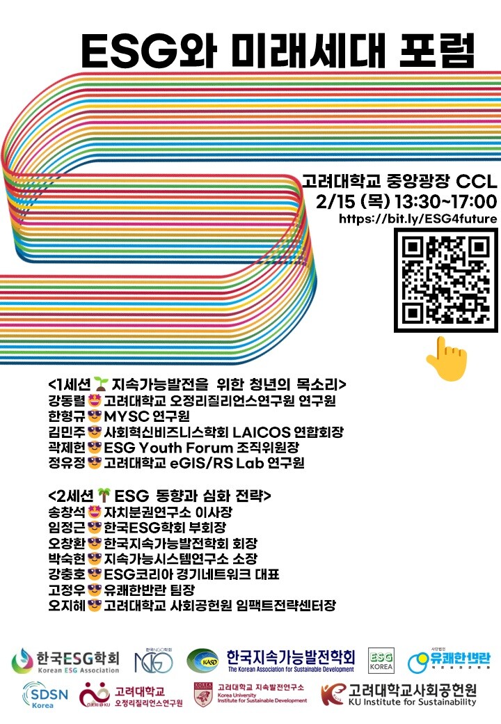 [대학저널 이선용 기자] 고려대학교 사회공헌원은 2월 15일 고려대 중앙광장 지하 1층 CCL에서 ‘ESG와 미래세대 포럼’을 개최한다고 13일 밝혔다.