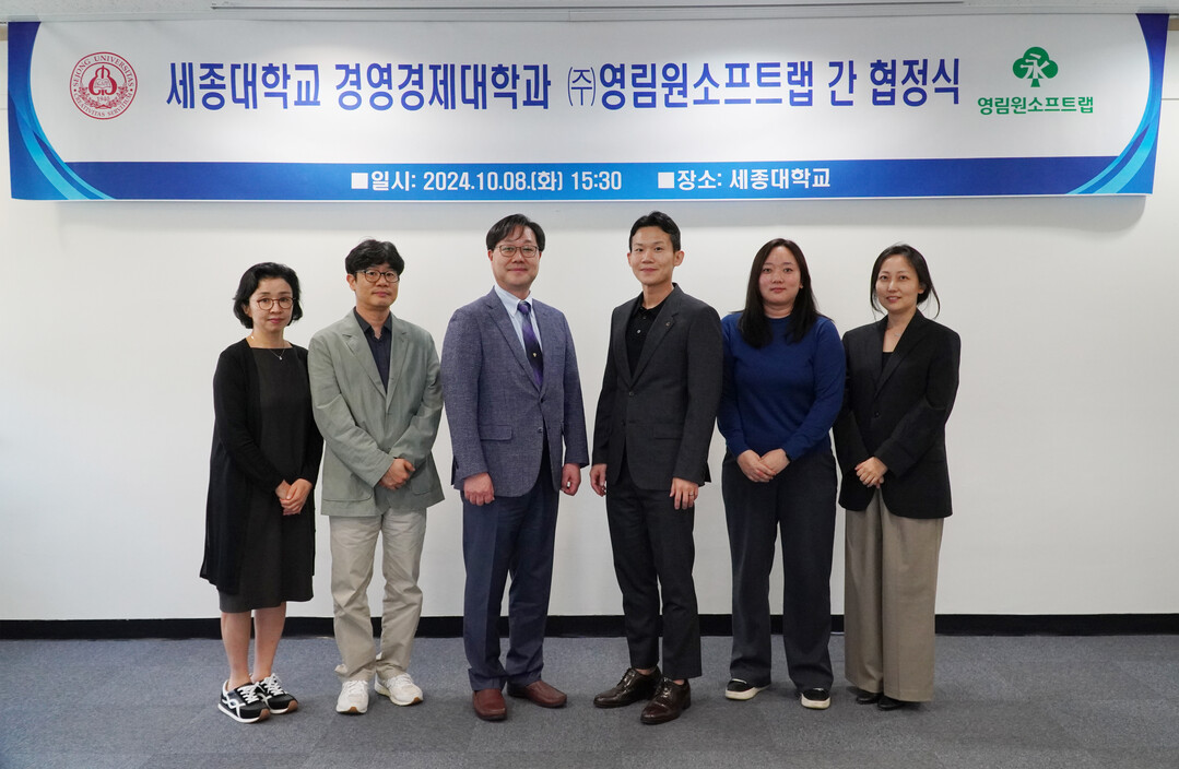 이날 협약식에는 세종대 경영경제대학 허재영 학장, 김형욱 대외협력처장, 이희수 경영학부장, 홍수정 교수, 영림원소프트랩 권오림 사업총괄, 사업개발 손민지 매니저가 참석했다.