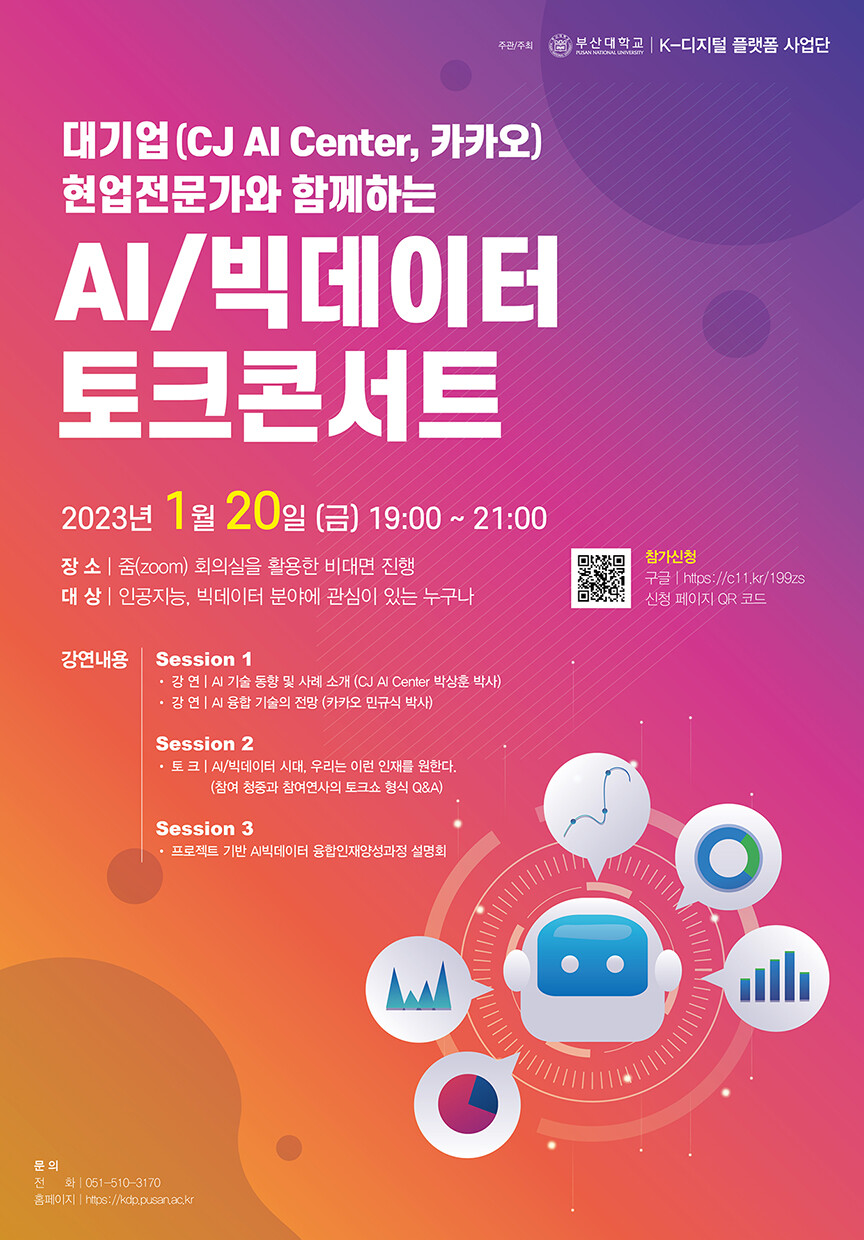 12일 부산대에 따르면 콘서트에서는 ‘AI 기술 동향 및 사례 소개’를 주제로 CJ AI Center 박상훈 박사가 연사로 나서 4차 산업혁명으로 AI와 빅데이터 기술이 어떻게 산업을 변화시키고 있는지와 그에 대응하기 위한 기업의 움직임을 사례를 통해 살펴본다.