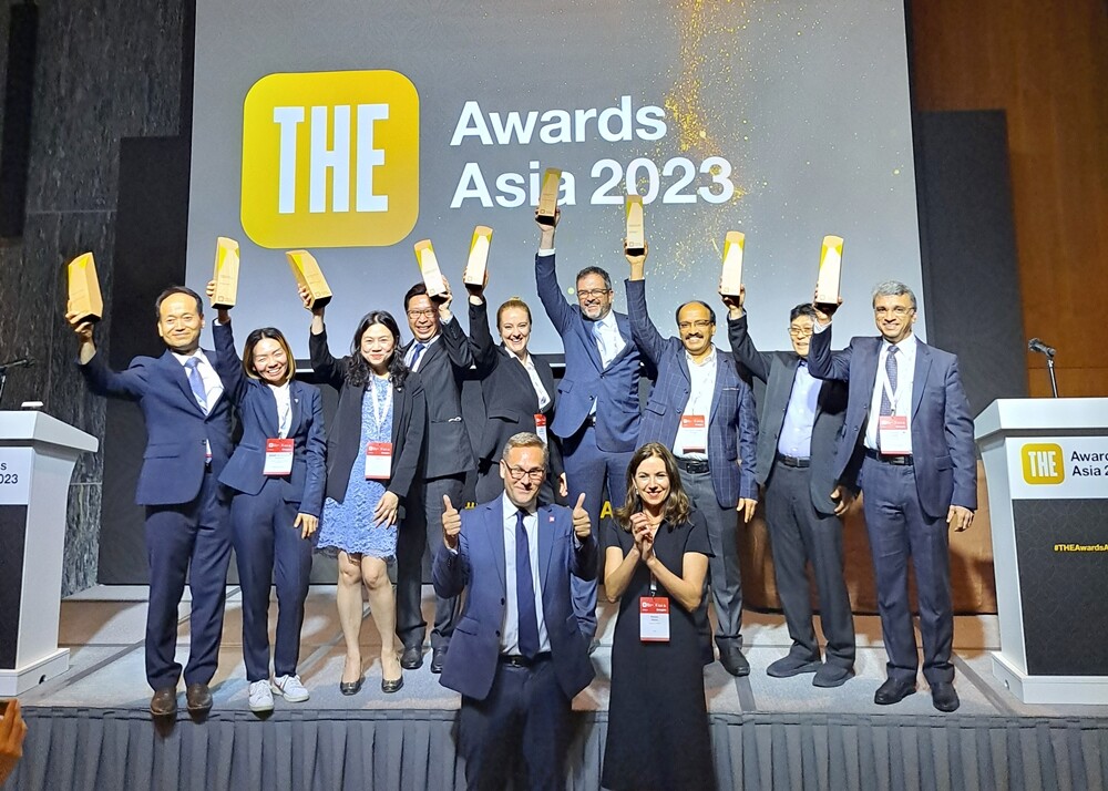 THE 어워즈 아시아 수상자들이 기념촬영을 하고 있다. 뒷줄 맨왼쪽이 최영도 UNIST 행정처장. 사진=UNIST 제공 |