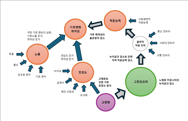 기후 변화 적응, 고령화 및 그린 인프라 간 상호작용에 대한 이론적 틀. |
