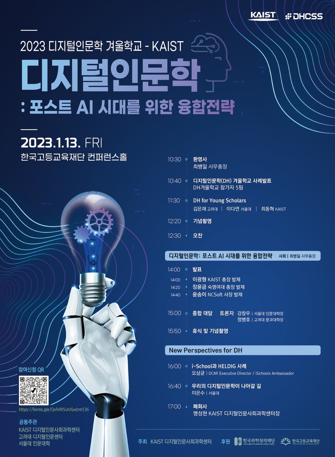 2023 디지털인문학 겨울학교는 KAIST 디지털 인문사회과학센터가 주최하고, 고려대 디지털인문센터, 서울대 인문대학이 협력한다. 디지털인문학 분야 석학들이 강연하고 대담회를 여는 심포지엄을 연계한다.