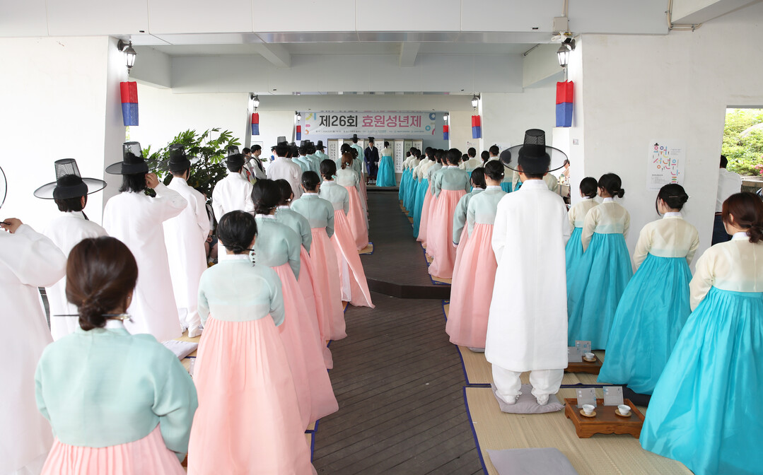 해로 26회째를 맞은 ‘부산대 효원성년제’는 1999년 ‘한문학과 전통성인식’으로 시작해 현재는 부산대 전체의 행사로 발전했다. 해마다 성년의 날(매년 5월 셋째 월요일, 올해는 5월 20일)을 기념해 성년이 되는 이들의 건강한 성장과 밝은 미래를 응원하며 책임감과 사회 참여의 중요성을 일깨우고자 개최해 왔다.