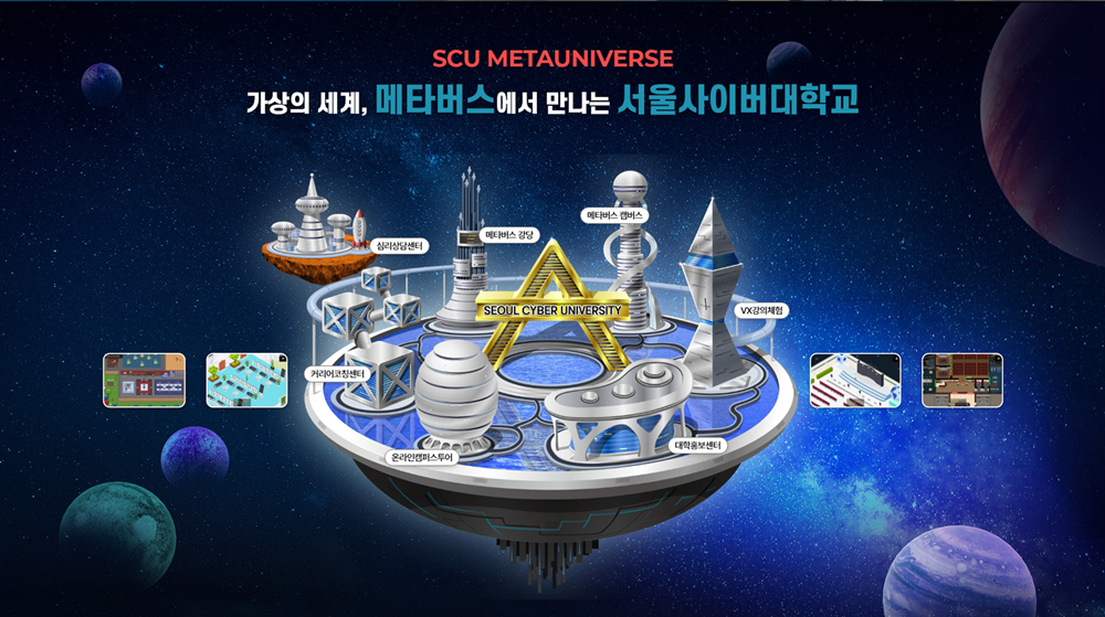 7일 서울사이버대에 따르면 이 대학 메타유니버스는 대학에서 운영하는 모든 메타버스 플랫폼(ZEP, 게더타운 등) 및 VR, VX를 한 번에 접속할 수 있는 서울사이버대만의 메타버스 관문 페이지이다.