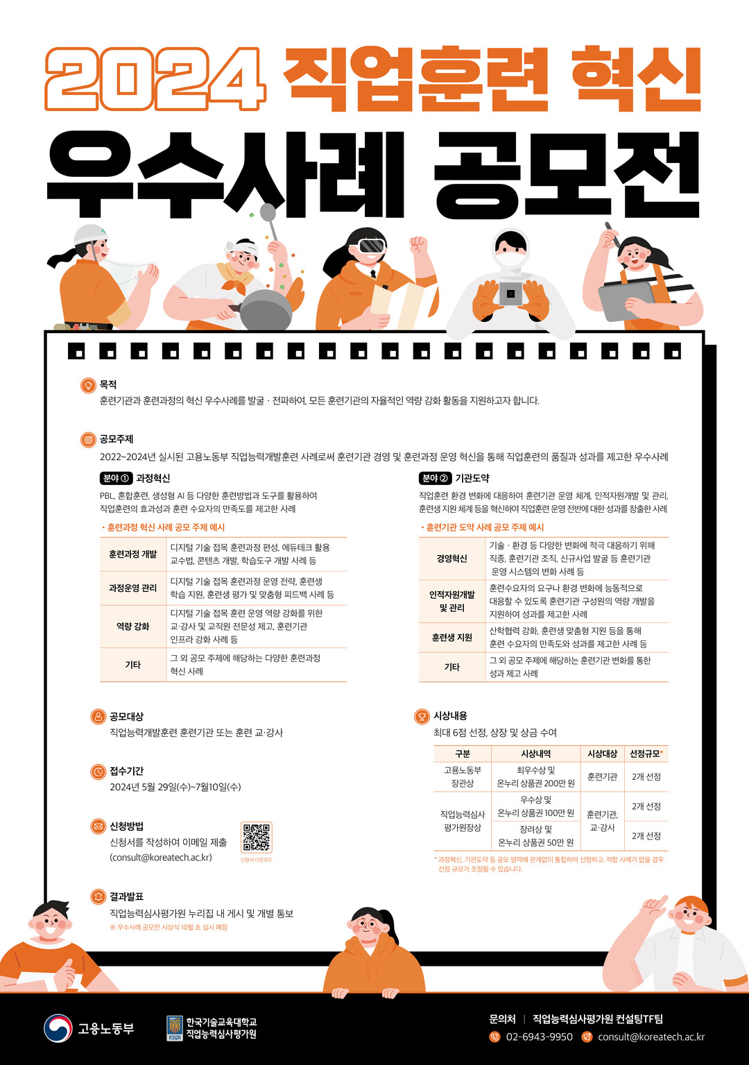 심사를 통해 최우수상 2점(고용노동부 장관상 및 상품권 200만 원), 우수상 2점(직업능력심사평가원장상 및 상품권 100만 원), 장려상 2점(직업능력심사평가원장상 및 상품권 50만 원) 등 총 6점의 우수사례를 선정할 예정이다. 선정사례는 온·오프라인 콘텐츠로 제작해 전체 훈련기관에 제공한다.