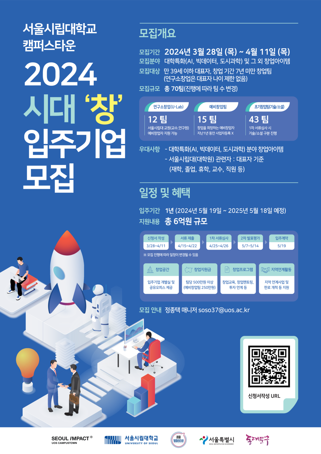 모집 대상은 만 39세 이하 대표자로 구성된 7년 미만(예비창업자 포함) 초기 창업팀이다. 분야는 서울시립대학교 캠퍼스타운 특화 분야인 AI, 빅데이터, 도시과학분야를 비롯하여 지역과 사회문제를 해결하기 위한 소셜창업 분야 등이며 다양한 창업아이템을 가진 누구나 다 지원할 수 있다. 또한 교내 창업활성화를 위해 서울시립대학교 교수 및 연구원이 대표자인 연구소창업(U-Lab) 분야는 대표자의 나이 제한 없이 신청할 수 있다.