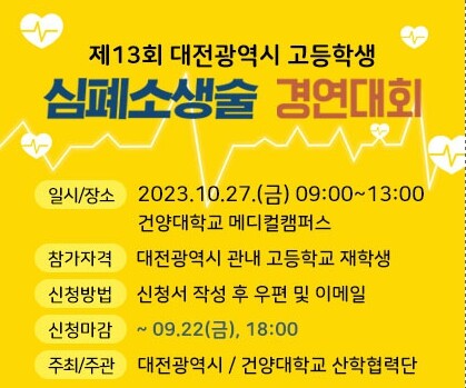 제13회 고등학생 심폐소생술 경연대회는 보건복지부와 대전광역시에서 주관하는 ‘2023년 심폐소생술 등 응급처치교육사업’의 일환으로 심폐소생술의 중요성을 알리고 심폐소생술 및 응급처치능력을 향상시키기 위해 마련된 프로그램이다.