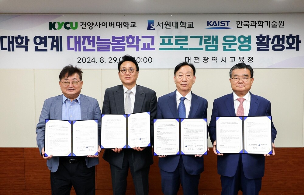 이날 협약식에는 이동진 건양사이버대 총장, 설동호 대전광역시교육감, 손석민 서원대 총장, 조규성 KAIST 책임교수 등이 참석했으며, 이번 협약을 바탕으로 각 대학은 교육청과 지역대학과의 협력체계를 구축, 늘봄학교 프로그램 개발 및 우수 강사 양성 프로그램을 2024학년도 2학기 대전늘봄학교 1학년 학생에게 제공하게 된다.