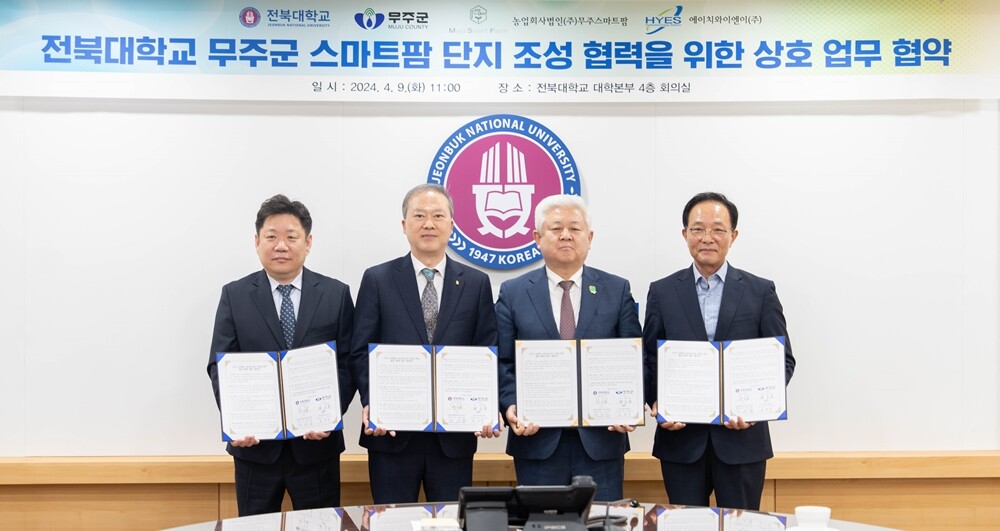 전북대는 9일 무주군과 농업회사법인(주)무주스마트팜, 에이치와이엔이(주) 등과 업무협약을 체결했다.