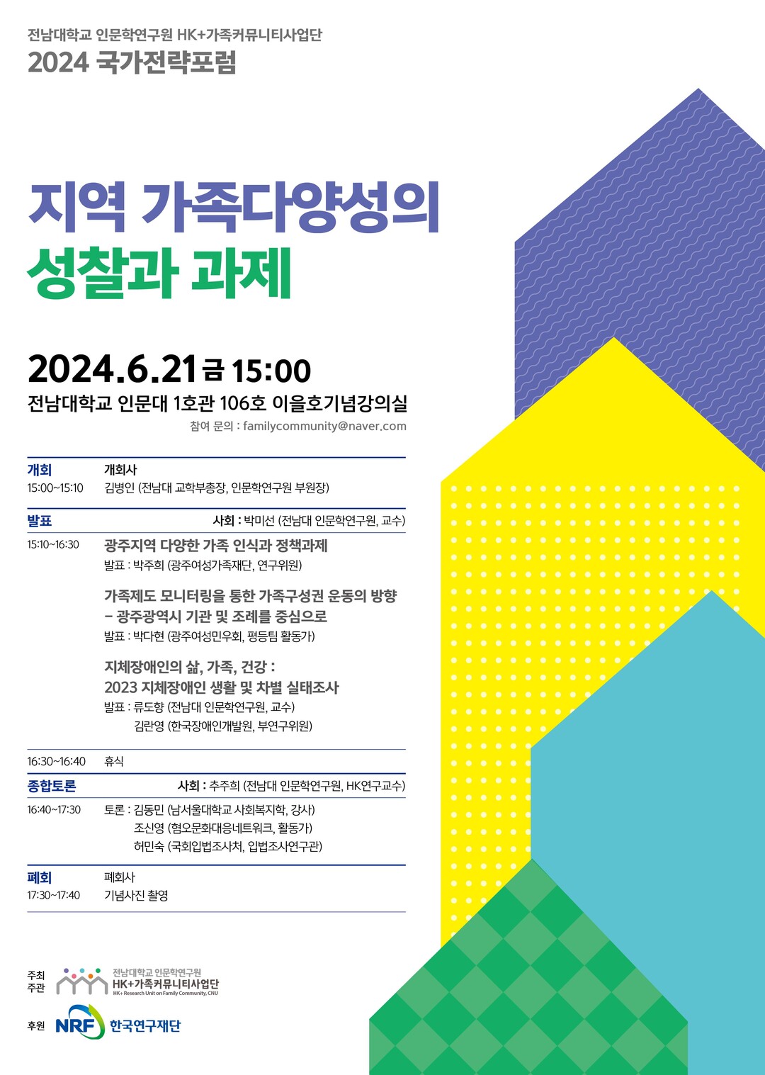 종합토론에서는 ‘광주지역 퀴어부모모임’을 지원하는 조신영(혐오문화대응네트워크) 활동가, ‘가족다양성 정책 및 동성애자 건강보험 입법과제’ 등을 연구해 온 허민숙(국회입법조사처) 입법조사연구관, ‘국립재활원 의료사회복지사로, 중증 장애인의 사회재활서비스 활동’을 담당해 온 김동민(남서울대학교) 교수가 참여한다.