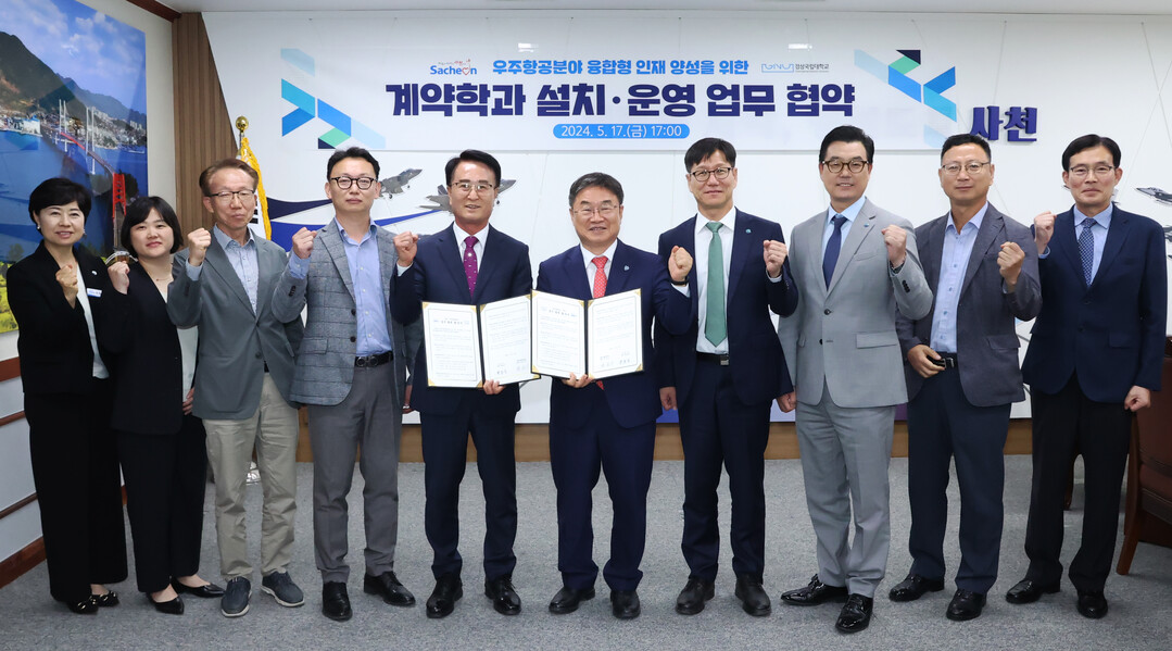 [대학저널 이선용 기자] 경상국립대학교와 사천시가 5월 17일 오후 5시 사천시청 시장실에서 우주항공 분야 융합형 기술경영인재를 양성하기 위해 ‘사천GNU사이언스파크 계약학과 설치·운영을 위한 업무협약’을 체결했다.