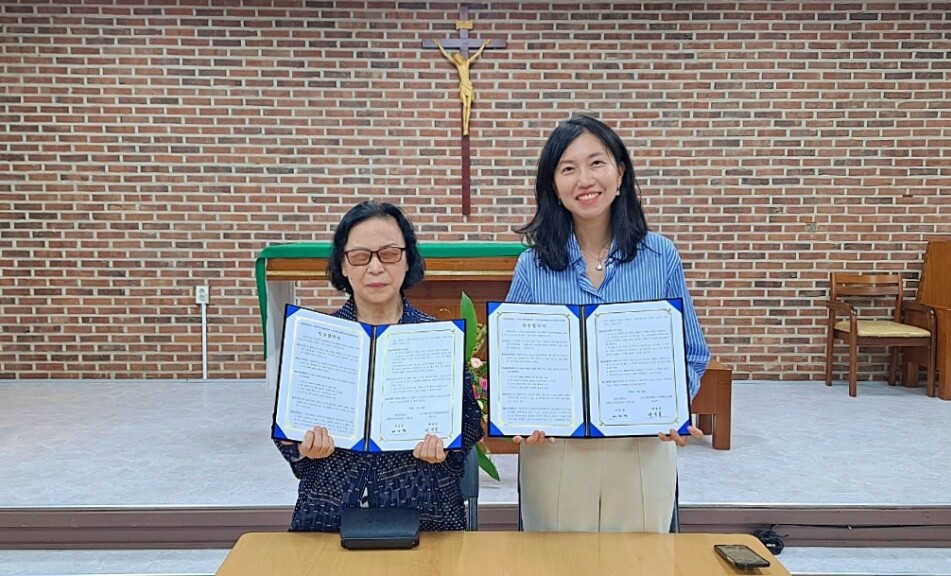 업무협약을 체결한 박영복 (사)서울가톨릭시각장애인선교회 대표이사(왼쪽)와 하민경 가톨릭대 사회적가치실현센터장. 사진=가톨릭대 제공 |