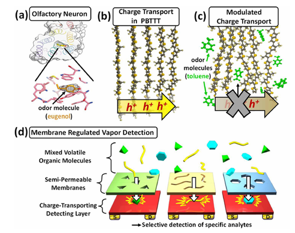 전자 코에 사용되던 금속 산화막 반도체(Metal Oxide Semiconductors) 기반 센서는 냄새 분자를 측정할 때 고온에서 작동해야 하므로 비용이 많이 들고 휴대가 어려웠다. OFET 센서는 상온에서 낮은 전압으로 구동되지만, 냄새 분자를 구별하는 변별력이 떨어졌다. 연구팀은 냄새 분자의 휘발성 화합물이 유기 반도체에 닿았을 때 전류 특성이 변하는 현상에서 문제의 해결책을 찾았다.