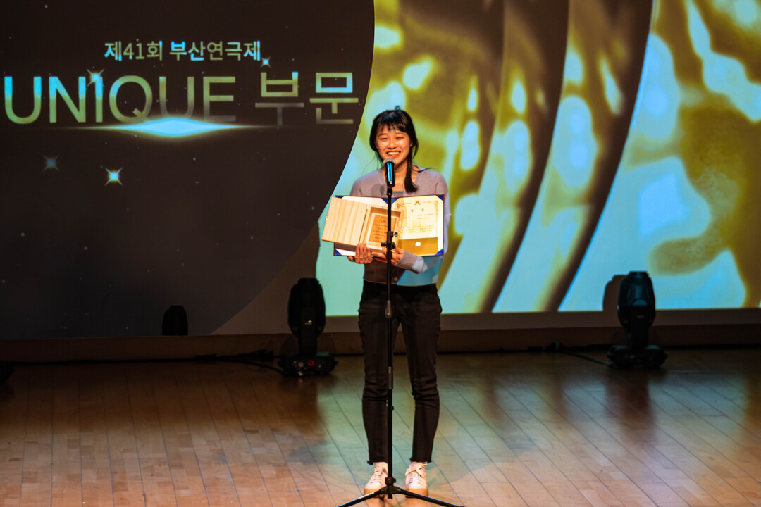| 영산대학교 연기공연예술학과 동문극단 물레방아의 최유경 대표가 제41회 부산연극제 수상 후 기념촬영하고 있다. 사진=부산연극협회 제공 |