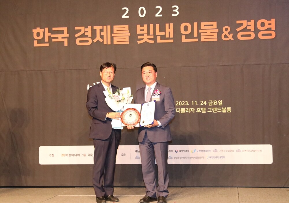 경동대 전성용 총장(오른쪽)이 24일 매경미디어그룹 ‘2023 한국경제를 빛낸 인물&경영’ 행사에서 인재경영부문 대상(大賞)을 받았다. 사진=경동대 제공 |