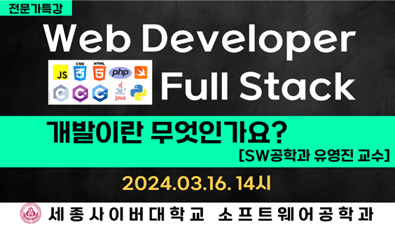 이번 전문가 특강은 국내 최고의 소프트웨어 개발 전문가인 유영진 교수가 진행하며 '풀 스택 웹 개발이란 무엇인가'에 대해 소개하고 풀스택 웹 개발자가 되기 위한 학습 전략을 소개하는 특강을 진행한다.