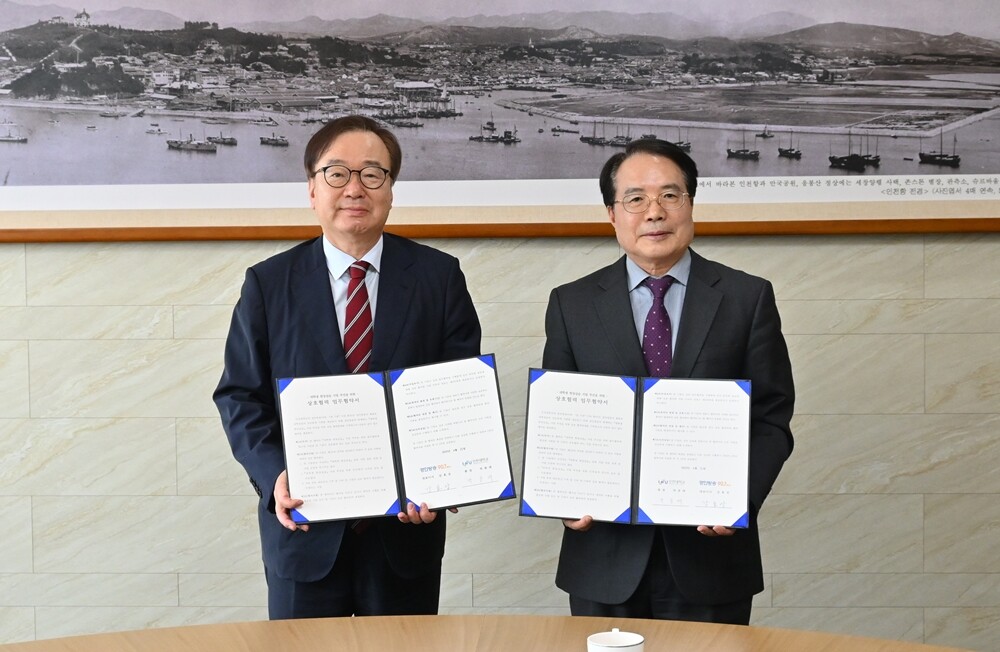 박종태(오른쪽) 인천대 총장과 강효상 경인방송 대표가 지난 21일 ‘대학생 현장실습’ 프로그램의 원활한 추진을 위한 상호협력 업무협약을 체결한 후 협약서를 펼쳐들고 포즈를 취하고 있다. 사진=인천대 제공 |