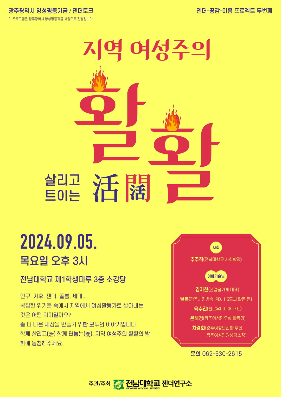 지역 여성주의의 현주소를 살피고 지역 공익활동의 방향을 성찰하는 ‘살리고(活) 터놓는(闊)’ 자리로, 관심 있는 시민 누구나 참석할 수 있다.