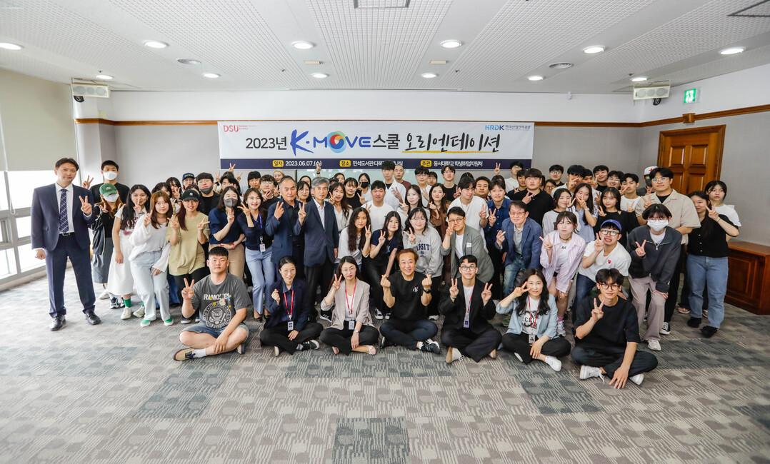 2023 K-Move 오리엔테이션 후 기념촬영을 하고 있다. 사진=동서대 제공 |