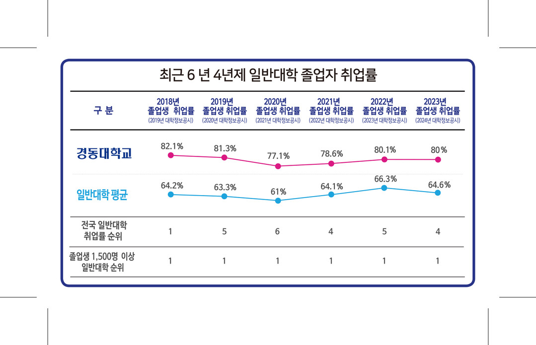 이로써 경동대는 2019년 말 공시에서 82.1%로 “205개 4년제 일반대학 전체 취업률 1위”를 기록한 이래, 꾸준히 전국 최상위권 취업률을 유지하게 되었다. 특수대학까지 포함한 “졸업생 1500명 이상 중대형 대학 전체 6년 연속 취업률 1위”라는 놀라운 성과이다.