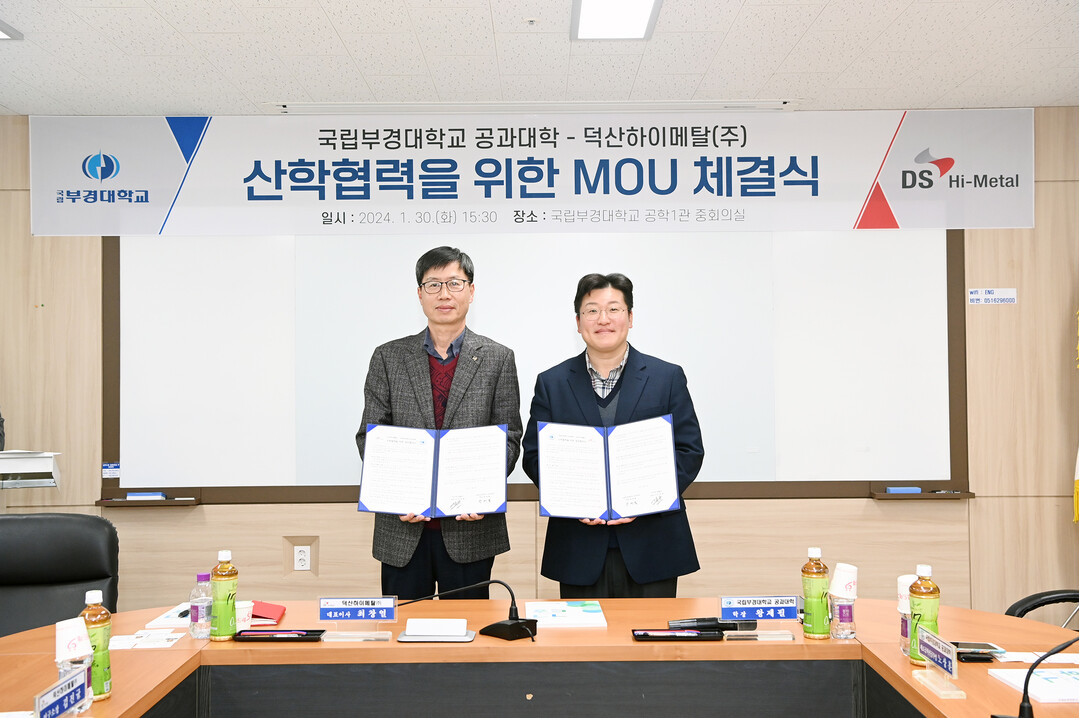 [대학저널 이선용 기자] 국립부경대학교 공과대학이 덕산하이메탈(주)와 1월 30일 오후 공학1관 2층 중회의실에서 반도체 패키징 소재 분야 전문인력 양성 등을 위한 산학협력 업무협약을 체결했다.