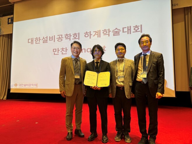 왼쪽부터 대한설비공학회 회장 최준영 박사, 국립한밭대 오인수 대학원생, 박병용 교수, 대한설비공학회 차기 회장 송두삼 교수. |