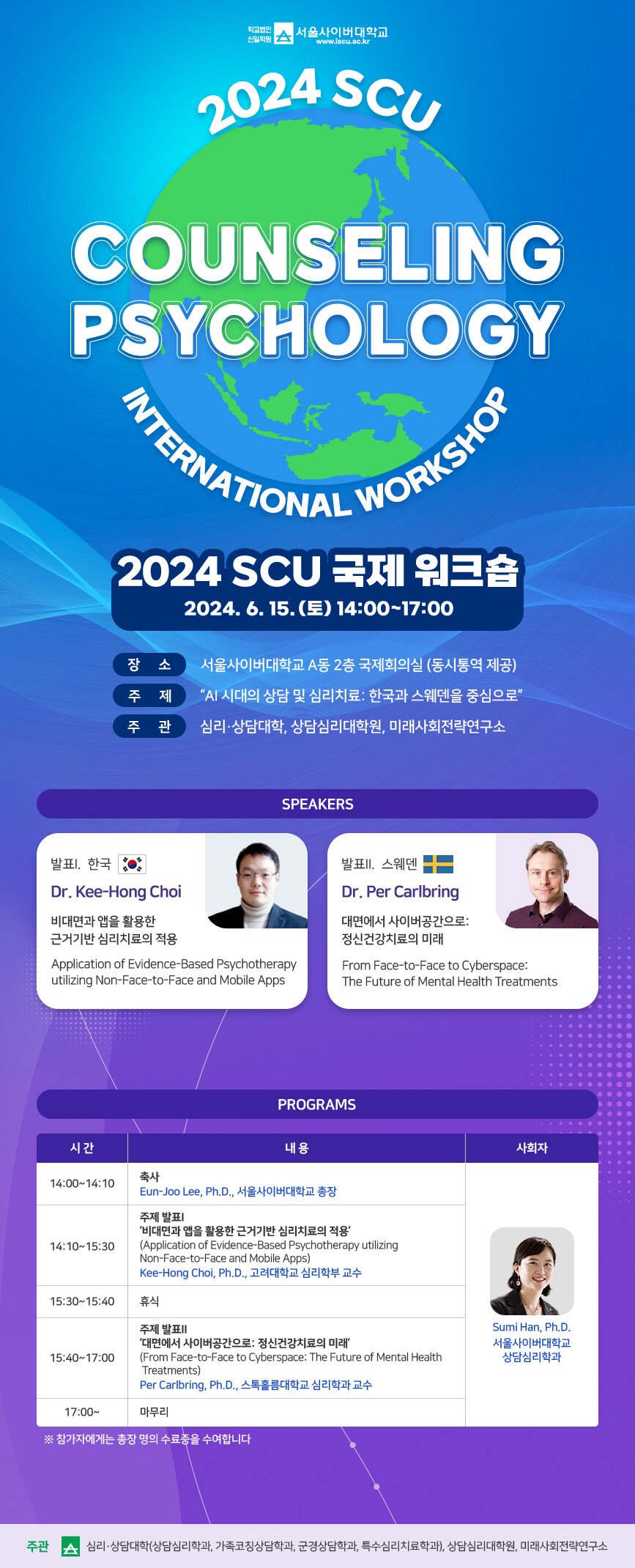 워크숍은 한국과 스웨덴의 발표자들을 통해 진행되며, 제1 주제는 최기홍 교수(고려대학교 심리학부장)의 ‘비대면과 앱을 활용한 근거기반 심리치료의 적용’, 제2 주제는 Dr. Per Carlbring(스톡홀름대학교 심리학과 교수)의 ‘대면에서 사이버공간으로: 정신건강치료의 미래’에 대해 각각 80여분의 발표 후 질의 응답이 이어질 예정이다. 사회는 서울사이버대 한수미 교수(심리·상담대학 학장)이 진행하며, 행사 이후 서울사이버대학교 유튜브 채널에 업로드될 예정이다.