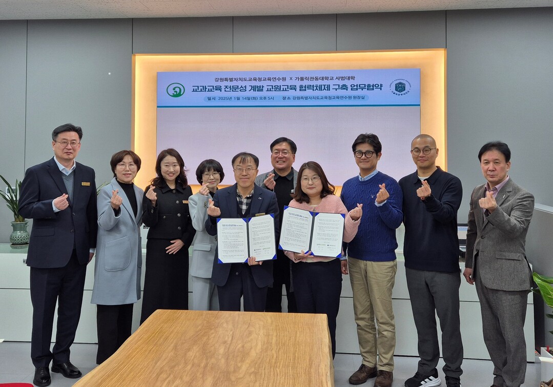 [대학저널 이선용 기자] 가톨릭관동대학교 사범대학은 강원특별자치도교육청 교육연수원과 1월 14일 교육연수원장실에서 「교과교육 전문성 계발 교원교육 협력체제 구축」을 위한 업무협약서를 체결했다고 16일 밝혔다.