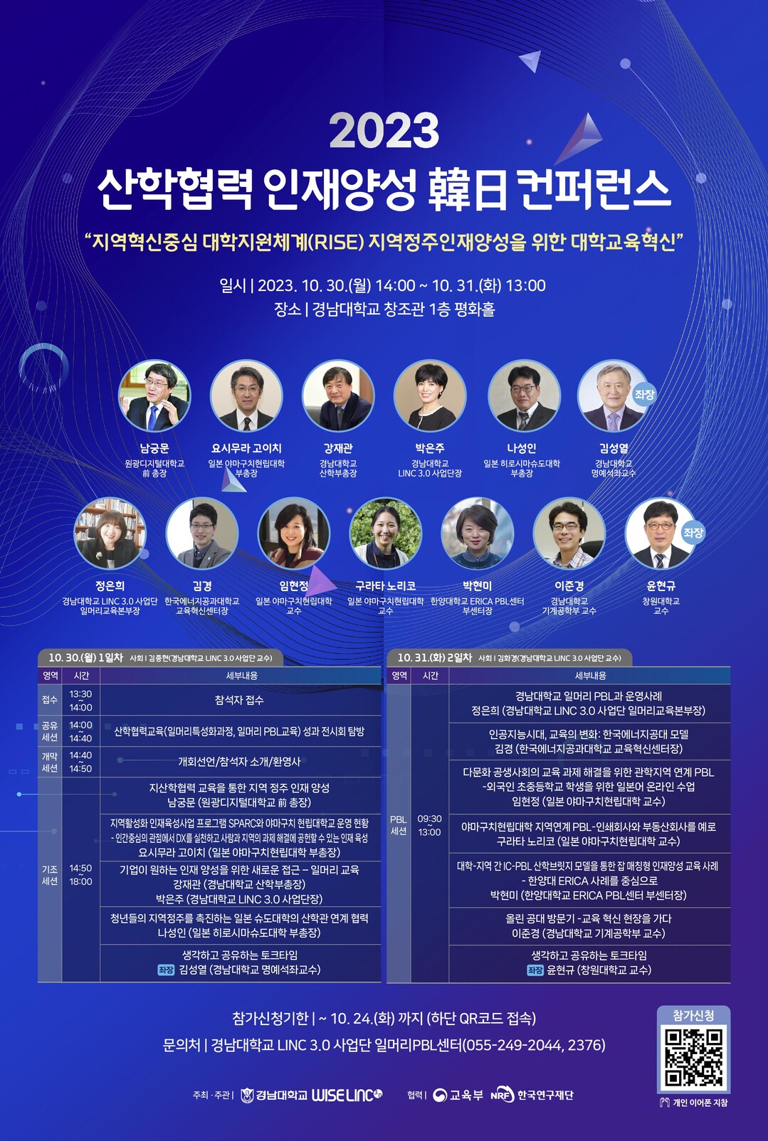 [대학저널 이선용 기자] 경남대학교 LINC3.0사업단이 10월 30~31일 양일간 경남대 창조관 1층 평화홀에서 ‘2023 산학협력 인재양성 한일(韓日) 컨퍼런스’를 개최한다.