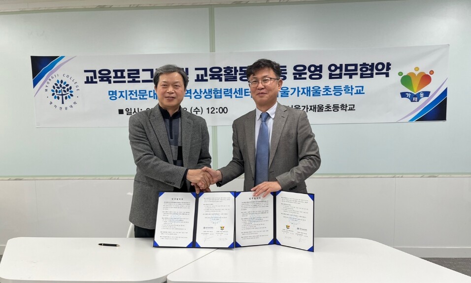 [대학저널 온종림 기자] 명지전문대학 명지지역상생협력센터가 지역의 학교와 대학의 파트너십을 위해 서울가재울초등학교와 업무협약을 체결했다.