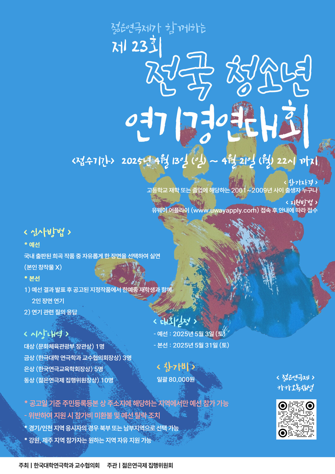 접수는 유웨이 어플라이에서 2025년 4월 13일부터 4월 21일 밤 10시까지 이루어지며, 예선은 5월 3일 대진대에서 개최된다. 이후 본선은 5월 31일 한국종합예술대학교에서 열릴 예정이다.