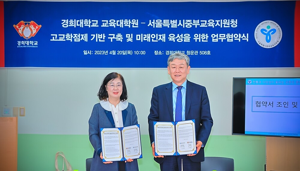 [대학저널 온종림 기자] 경희대학교 교육대학원과 서울특별시중부교육지원청이 20일 경희대 청운관 508호에서 ‘고교학점제 기반 구축 및 미래인재 육성’을 위한 업무협약을 체결했다.