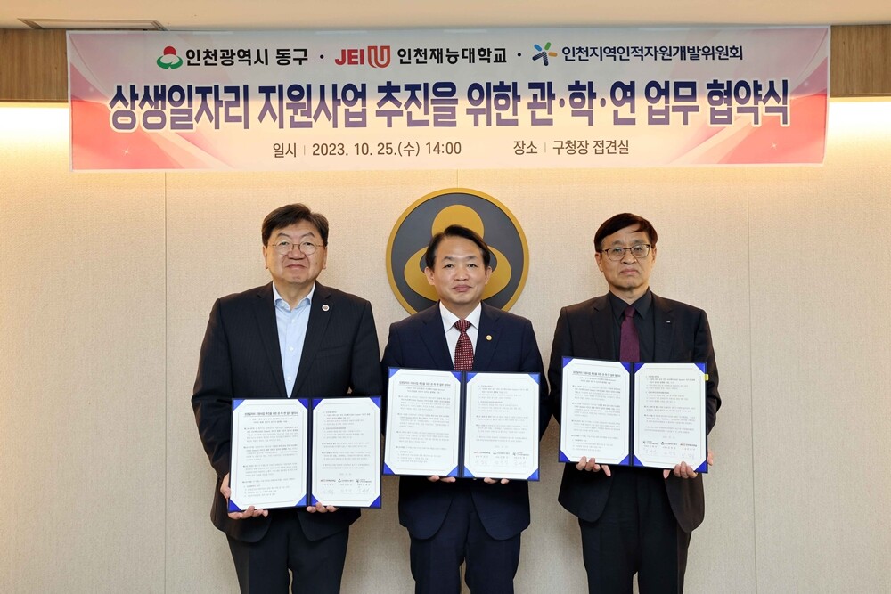 [대학저널 온종림 기자] 인천재능대학교가 인천 동구청, 인천지역인적자원개발위원회와 함께 ‘상생일자리 지원사업 추진을 위한 관·학·연 3자 업무협약’을 체결했다고 27일 밝혔다.