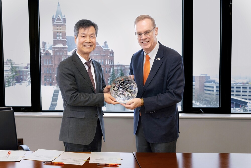서울시립대 원용걸 총장이 8일 미국 시러큐스대를 방문해 켄트 시버루드 (Kent Syverud) 미국 시러큐스대 총장 등과 신규 교류협정을 체결했다. 사진=서울시립대 제공 |